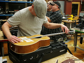 These Video studies include complete re-frets on the bound fingerboard and / or electric bass conversion: fretted to fretless (depending on the needs of the students); safe removal of acoustic guitar bridges and fabrication of a new bridge from a rosewood / ebony blank, calculating compensation for intonation and slotting the new bridge for saddle placement, compensated nuts / saddles fabricated from bone blank, acoustic guitar fingerboard / neck removal, broken head-stock ( splicing ) repair and touch-up; repair and replacement of loose braces; fabrication and installation of cross-grain quarter-sawn splices for repair of cracks and fractures, a study of hide glue and it's practical applications, French polish / lacquer-stick for fret repair touch up, installation of an on-board acoustic-electric system; basic practical soldering and wiring technique for pick-up replacement, input jacks, volume and tone controls.